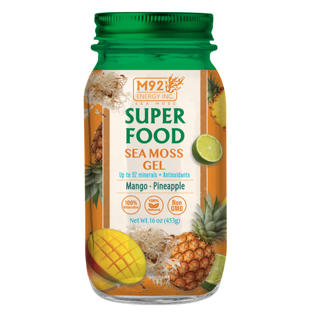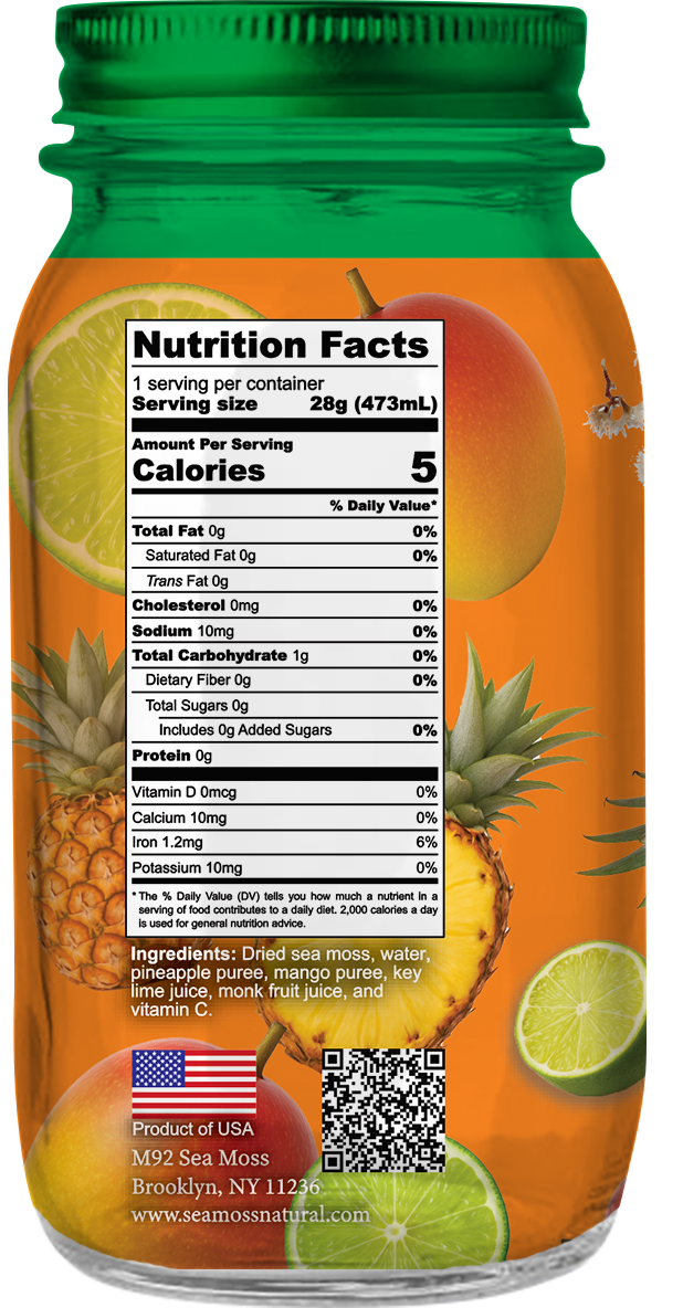 Elevate your wellness routine with a burst of tropical goodness. M92 Mango Pineapple Sea Moss Gel combines wildcrafted sea moss with ripe mango, sweet pineapple, a splash of lime, and pure water, creating a smooth blend rich in vitamins, minerals, and tropical enzymes.