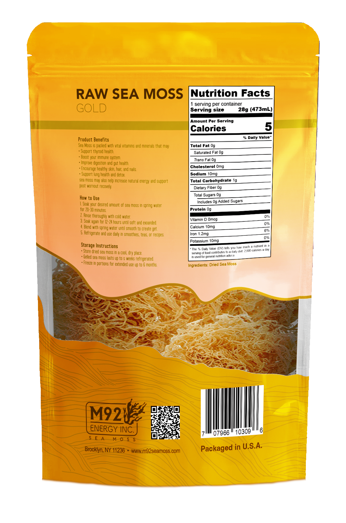 M92 Golden Crispy Sea Moss is premium, wild-harvested sea moss that has been sun-dried to a crisp, golden finish—preserving its mineral-rich structure while giving it a light, crunchy texture. Sourced from clean ocean waters and naturally dried without salt or additives, this variety is known for its versatility and milder flavor profile. This golden sea moss contains no added salt and maintains a low moisture content of 5–10% to ensure long-lasting purity and potency.